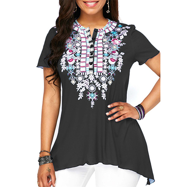 a relaxed silhouette with floral print, a button front design, an irregular hem, a round neckline, a short sleeve.