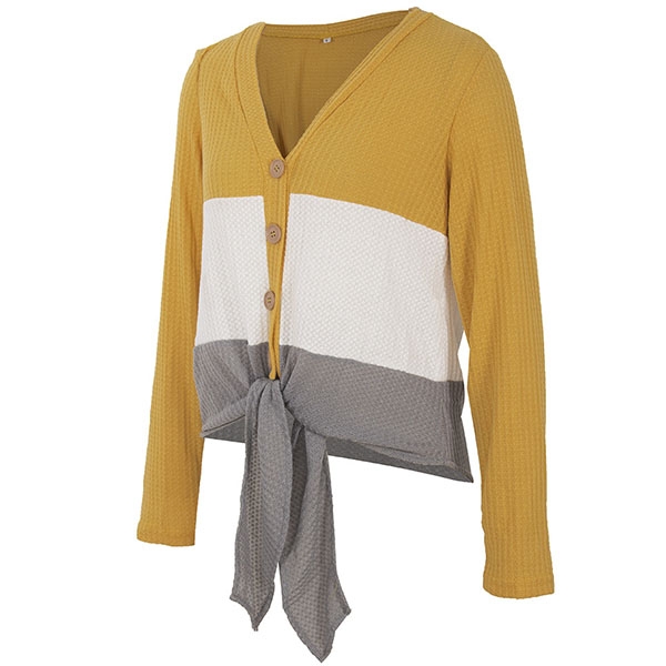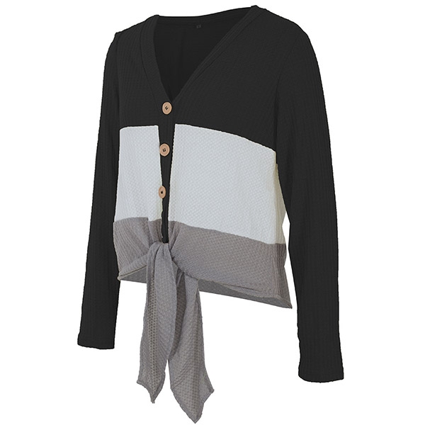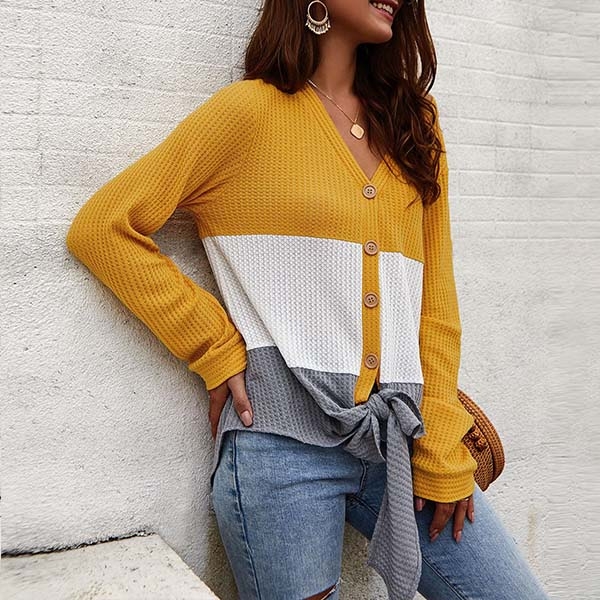 with long sleeve,v-neck,front-button and knotted hem design,chic,unique yet attractive.