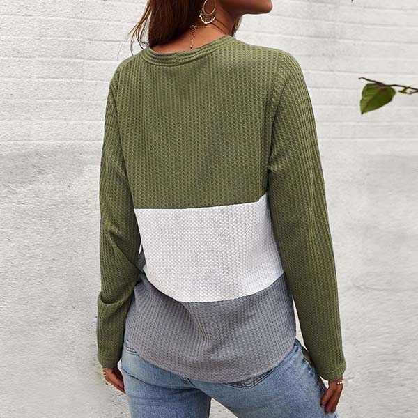In these spring and autumn days,this knit top can easily strike your mind. Contrast color style,