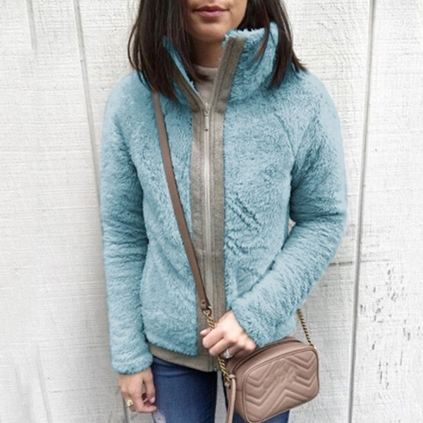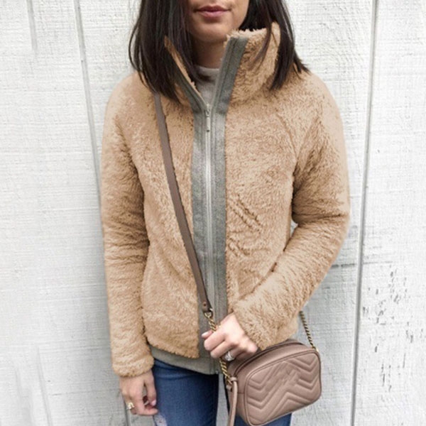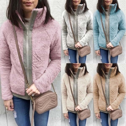 stand collar and front zipper closure,this simple yet stylish plush coat can keep you warm and comfy