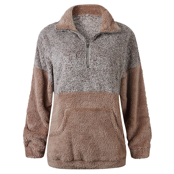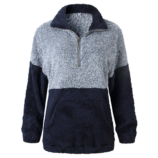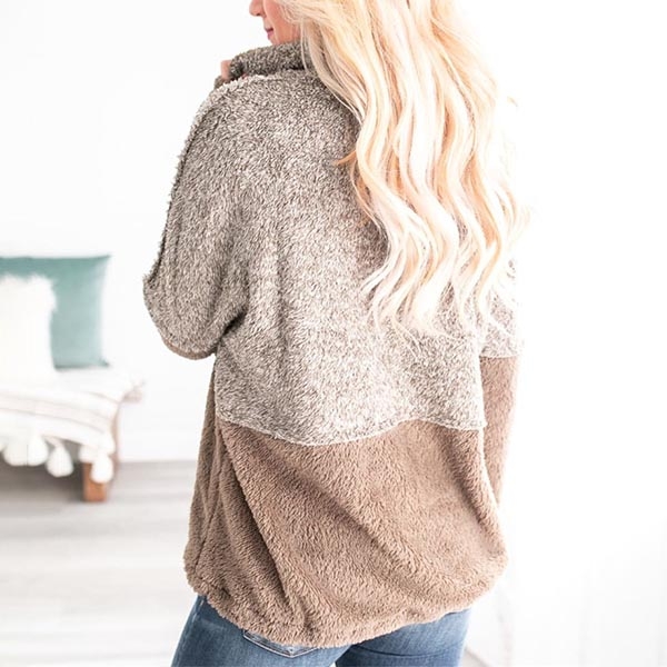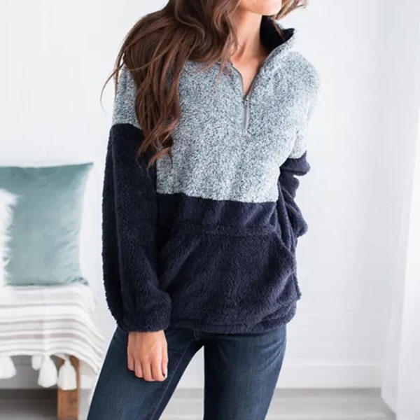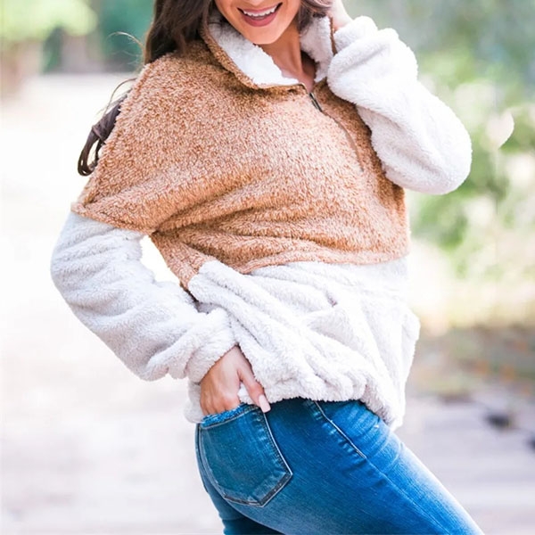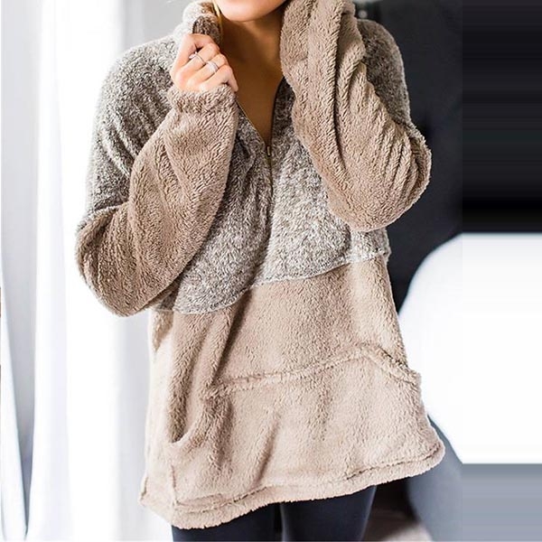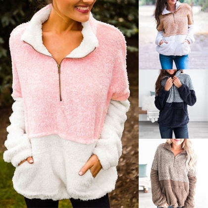 Contrast color style,crafted from soft and cozy plush fabric,with long sleeve and stand