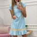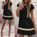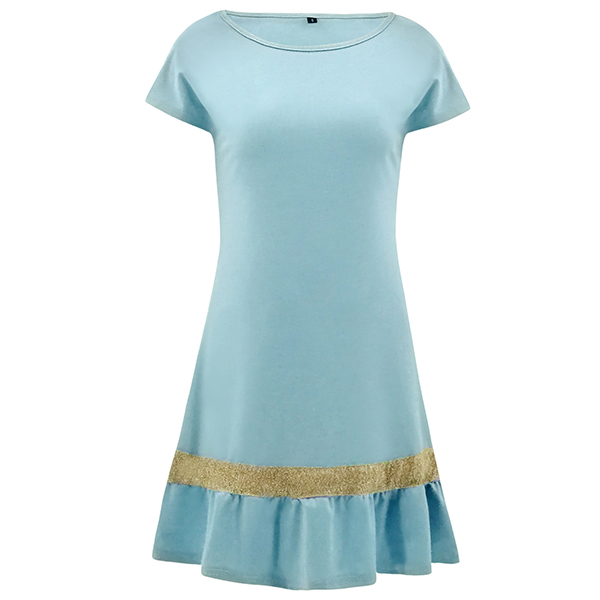 and soft polyester fabric woven,with round-neck,short sleeve and pleated hemline.One gold line underneath