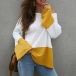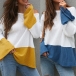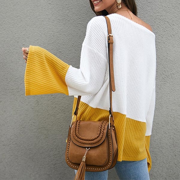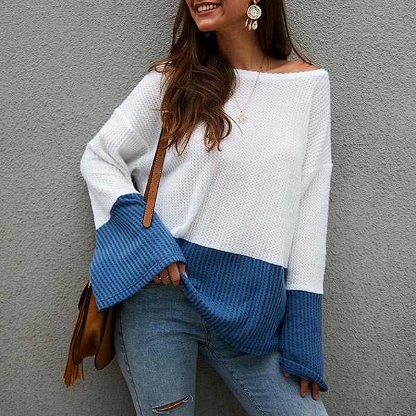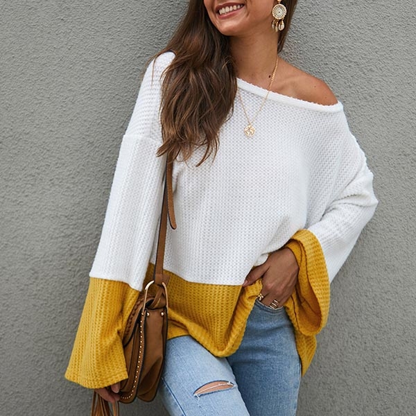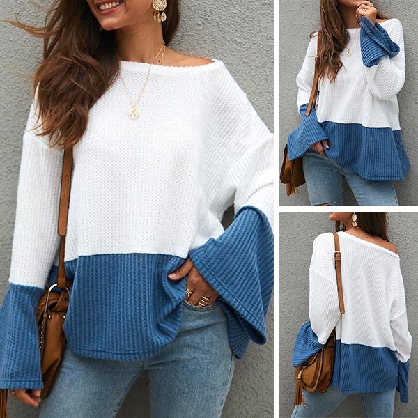 The contrast color trend is still going strong,so we suggest you this knit top which is designed with contrast color element. Moreover,the trumpet