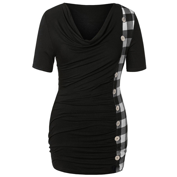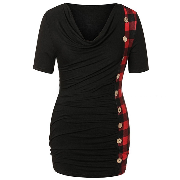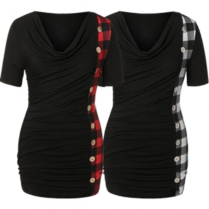 this piece look so attractive? It owes to the cowl neck,side-buttons and plaid spliced design.