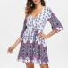The dress in a polyester weave with trumpet sleeve and contrast color and pleated hem.Lotus spliced,