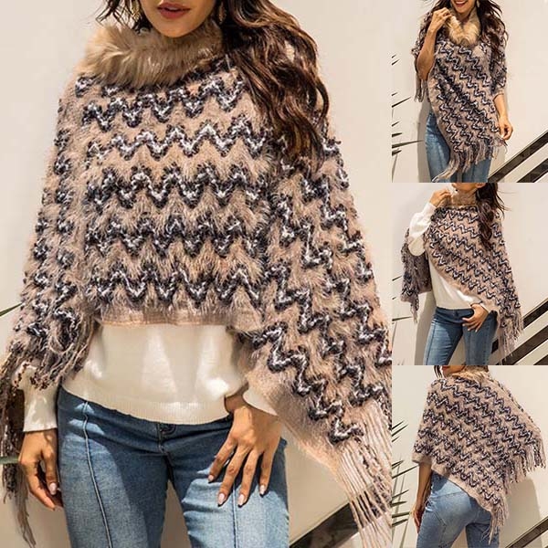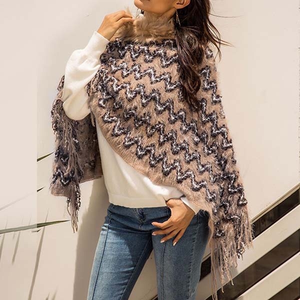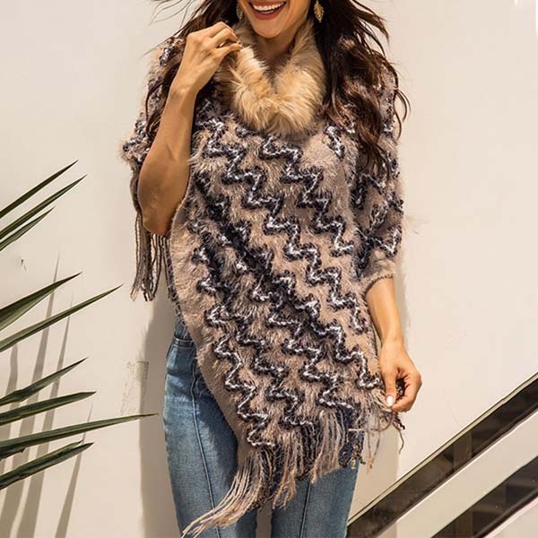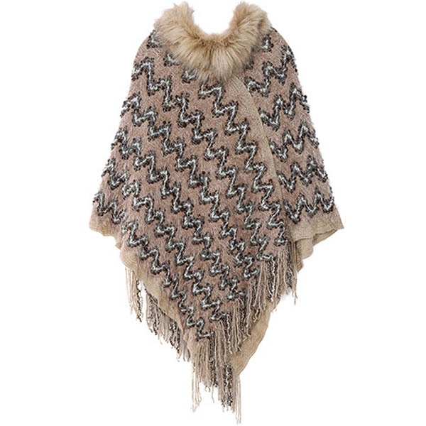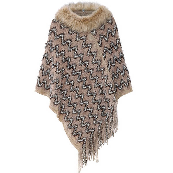 and distinctive design details like faux fur spliced collar and irregular tassel hem design make