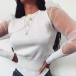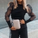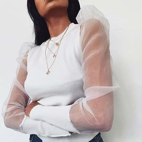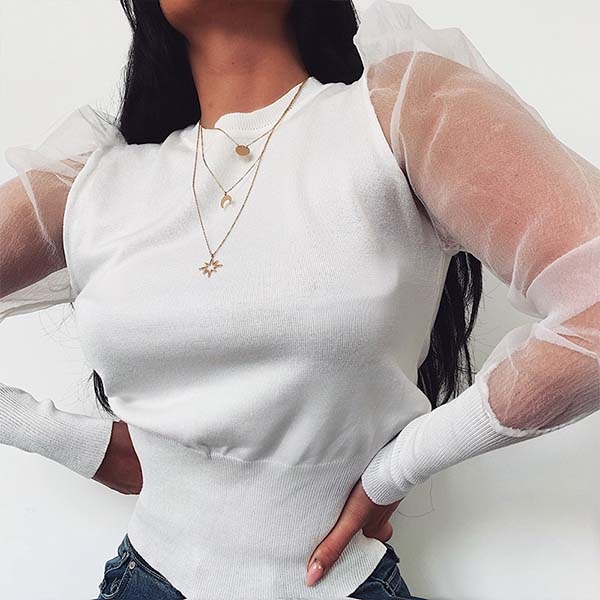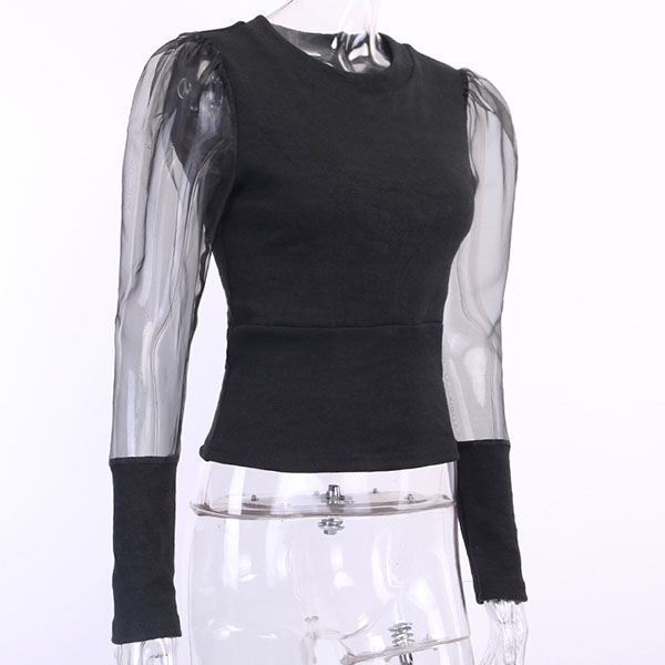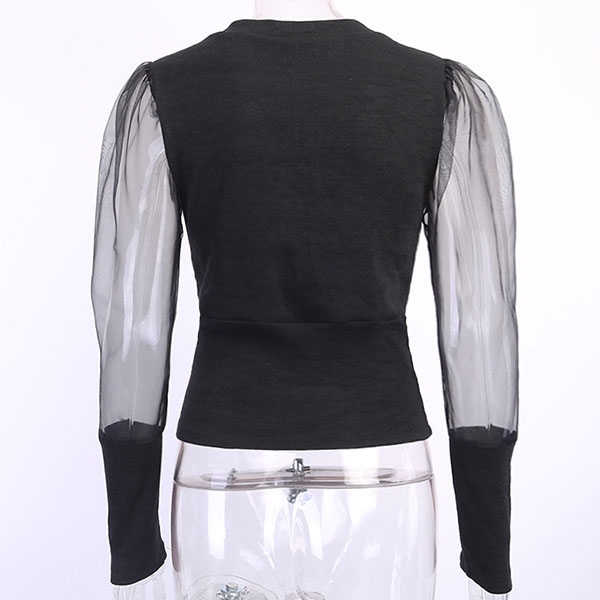 Crafted in a solid color,the gauze spliced long sleeve design makes this piece look so