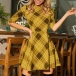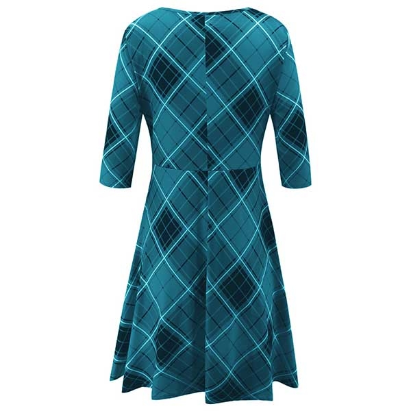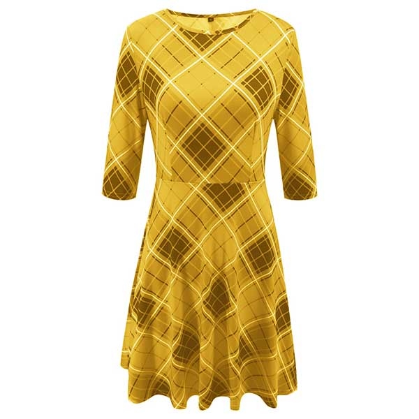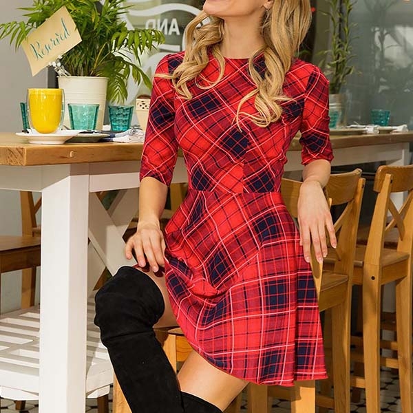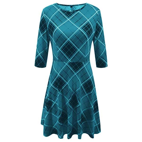 Designad med rutigt element, tillsammans med halvärm, rund hals och en A-linje siluett,
