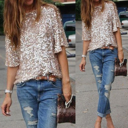 Outfitted with half sleeve,round neck and a loose silhouette,this sequin t-shirt can give you a stylish