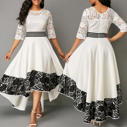 a lace spliced bodice, a round neck, middle sleeve, a high waist with contrast color design,
