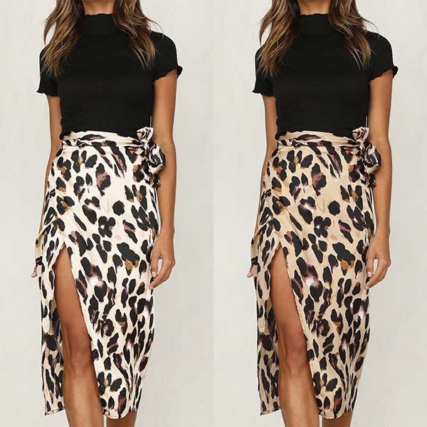 denna leopardmönstrade kjol. Den här kjolen är designad med hög midja och kjolfåll, vilket kan erbjuda dig många