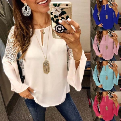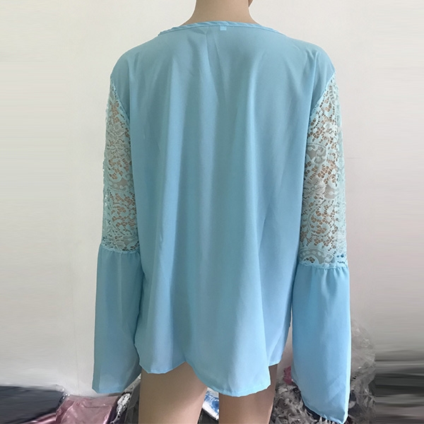 with exquisite trumpet sleeve,solid color ,round-neck and hollow out design.Embroidered pattern style which