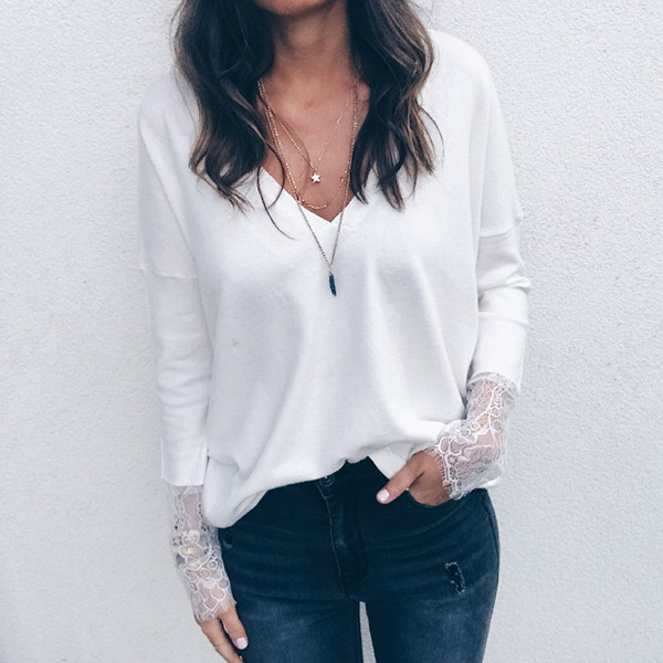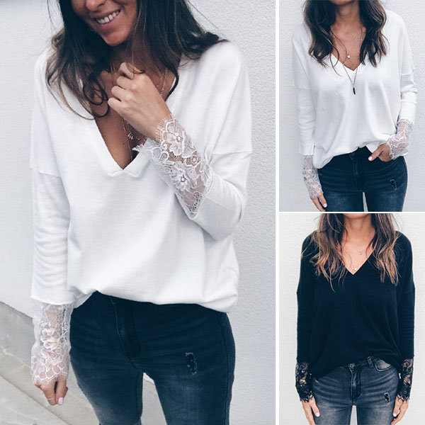 Styled with a solid color,the lace spliced cuff and v-neck design will boost the charm of this t-shirt.