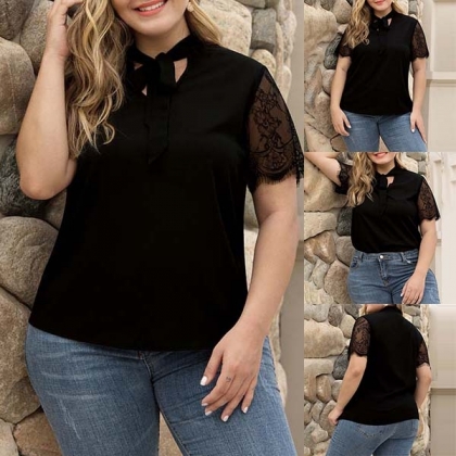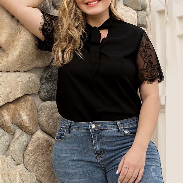 This top features a classic,stylish yet flattering black tone,the lace spliced short sleeve and lace-up