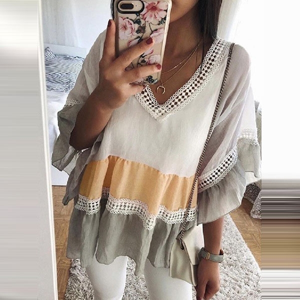 fabric,designed with 3/4 lotus sleeve,v-neck and a loose silhouette,this piece can promise you an utmost