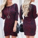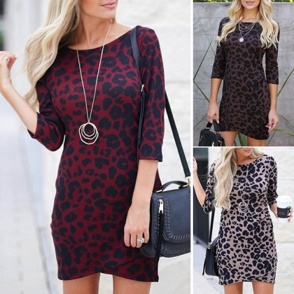 Fashion Leopard Print 3/4 Sleeve Round Neck Slim Fit Dress