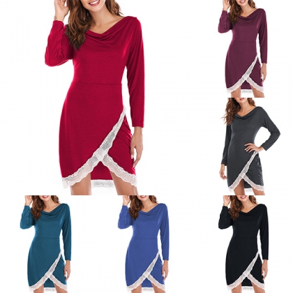 The cowl neck and lace spliced irregular hem design make this piece look so attractive and distinctive.