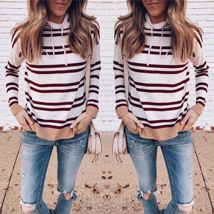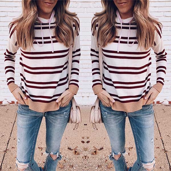 This sweater that is designed with striped element can easily enhance its charm. Moreover,the drawstring