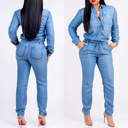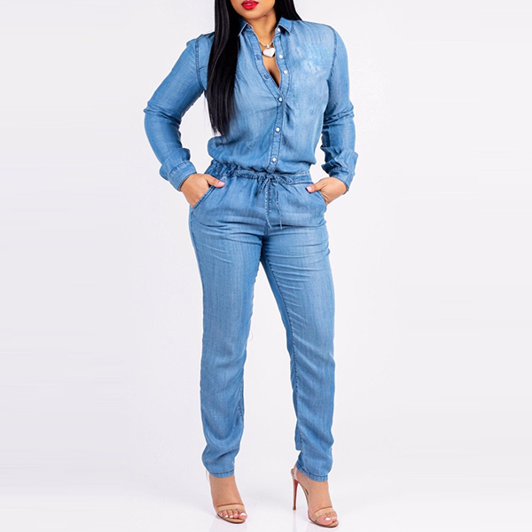 långärmad, POLO-krage, hög midja och en passform siluett, den här jeansoverallen kan visa upp din smala