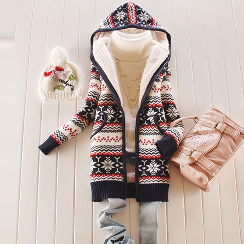 Your wardrobe should have this warm knit coat! It features snowflake printed style,