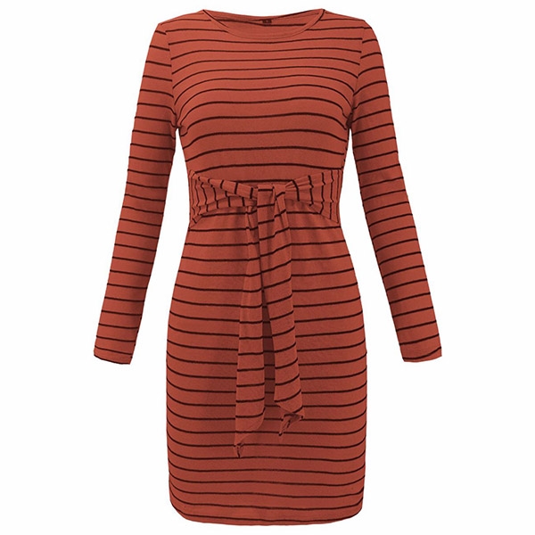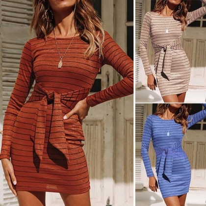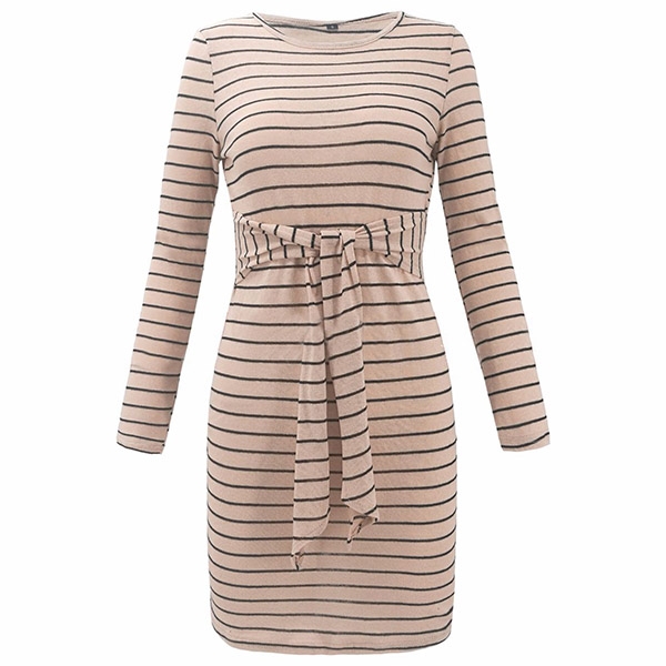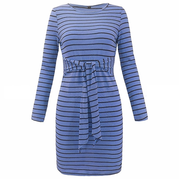 This knit dress is designed with striped element,long sleeve and round neck design,simple yet stylish.