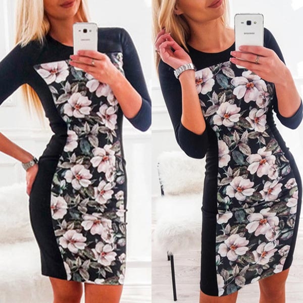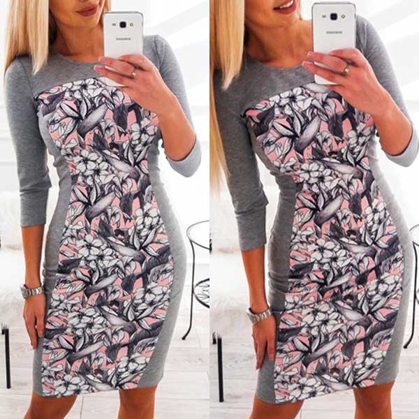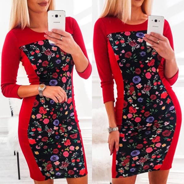 Fashion Long Sleeve Round Neck Slim Fit Printed Spliced Dress