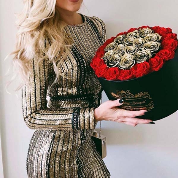 gatherings. This sequin dress is finished with long sleeve,round neck and a fit silhouette,which can showcase