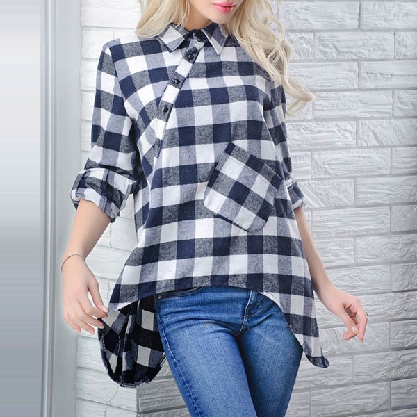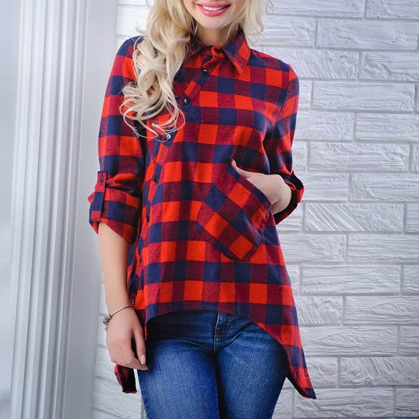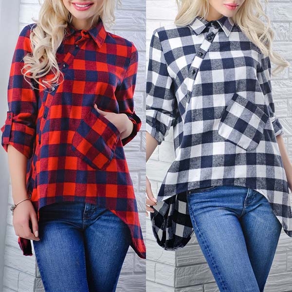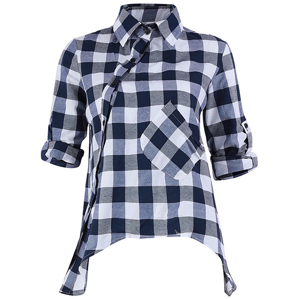 Designed with plaid element,the side-buttons and irregular hem design make this piece look so distinctive