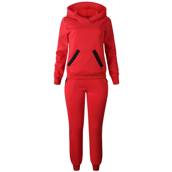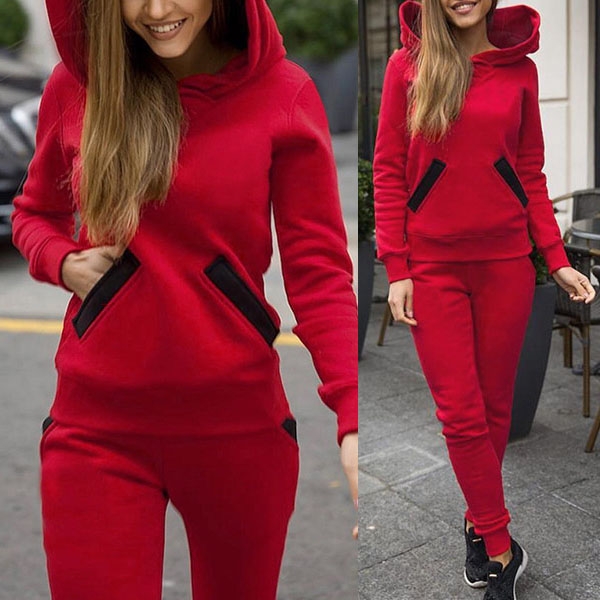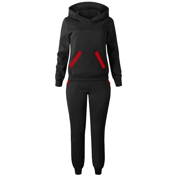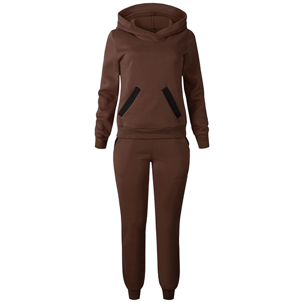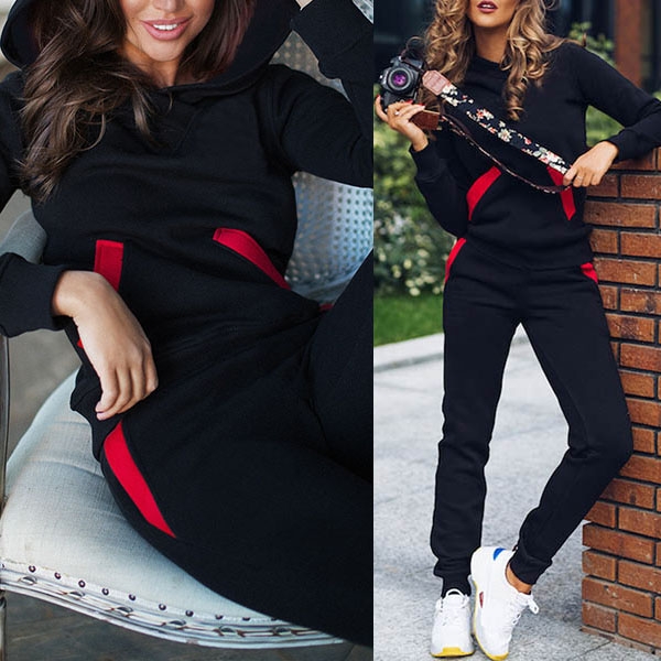this season. This two-piece set feature a top with hood spliced design, long sleeves, a kangaroo pocket with contrast
