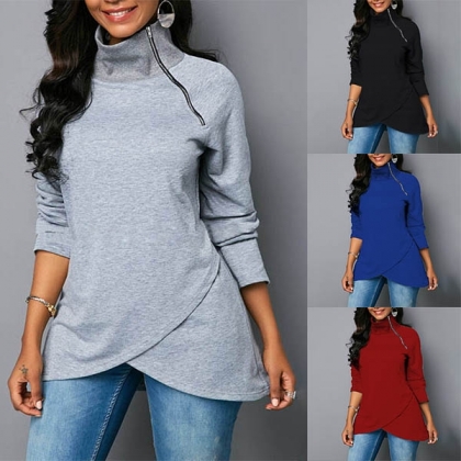 Fashion Long Sleeve Stand Collar Irregular Hem Sweatshirt