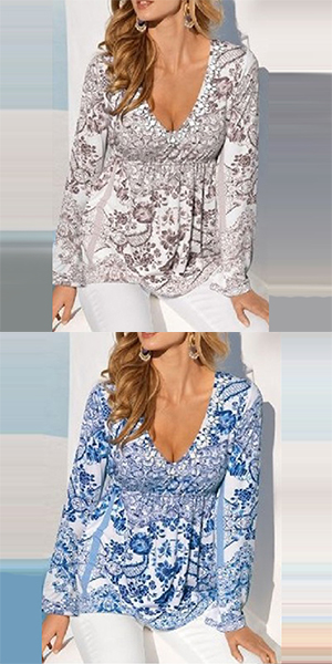 Fashion Long Sleeve V-neck Printed T-shirt