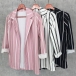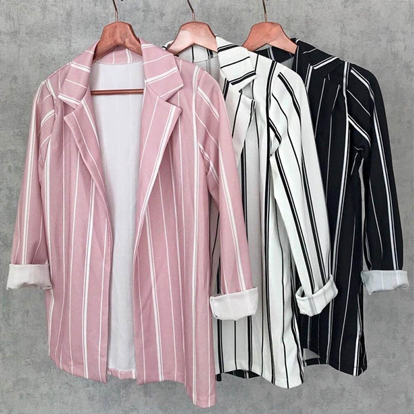 an allover stripe pattern, notched lapels, open front, and long sleeves, as well as the matching stripe