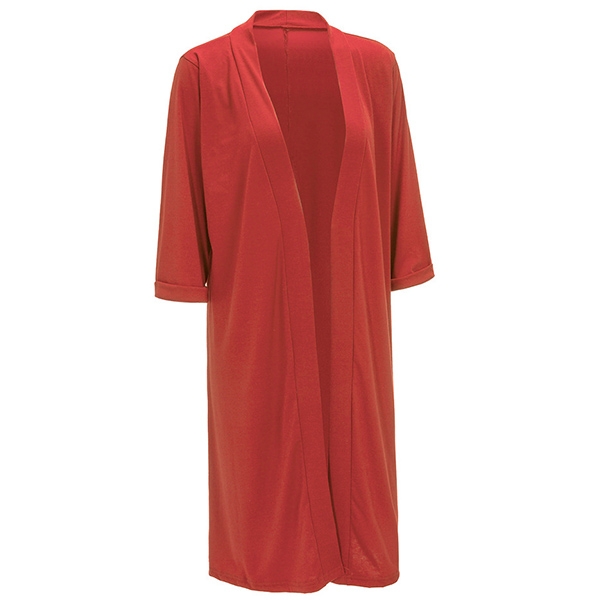 This knit cardigan feature a long-line silhouette with an open front design, middle sleeves,