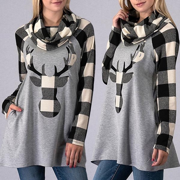 breathable fabric can offer you a comfortable day,while the elk printed,cowl neck and plaid element