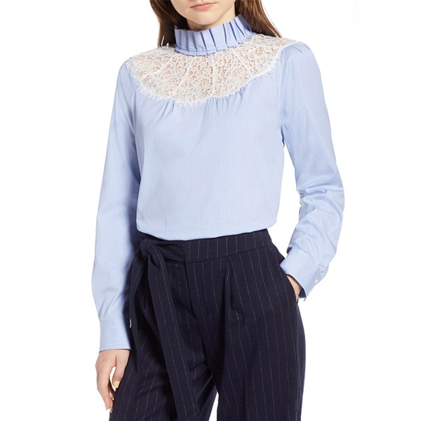with allover stripe pattern, feature with lace spliced design to elevate feminine charm, outfit with pleated high