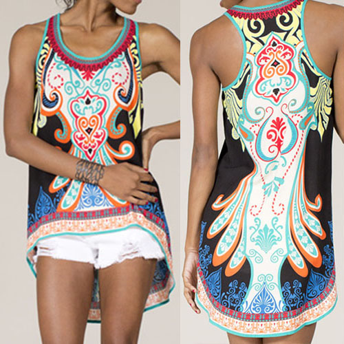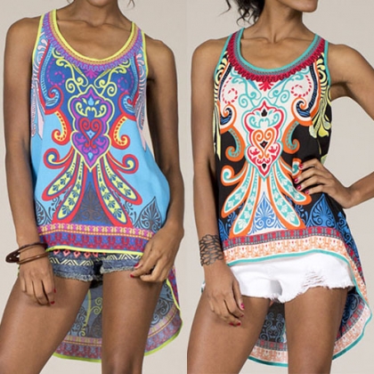 Features chic and eye-catching printed pattern,with a round neckline and a high-low