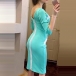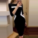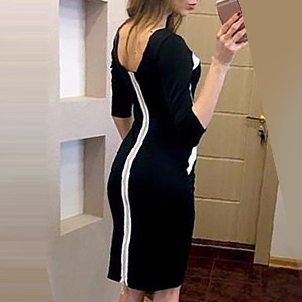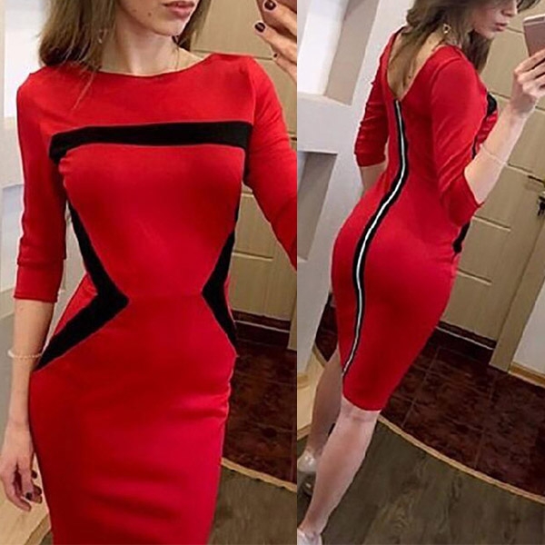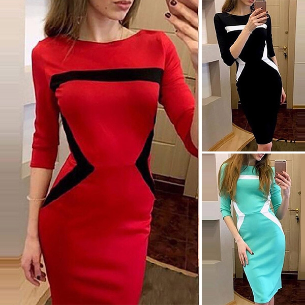 in a body-con silhouette, feature contrast color spliced design for a chic appeal, come with a 3/4 sleeve and
