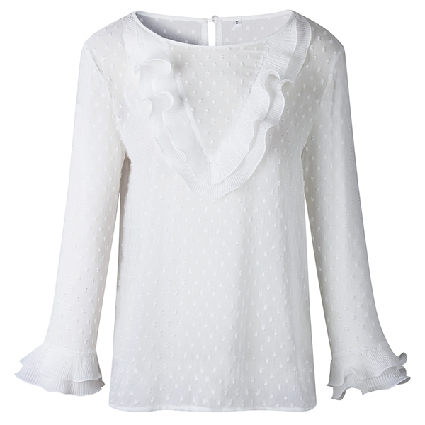 round-neck at the top and frills front and back that continue over the shoulders.Pearls are great decoration