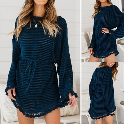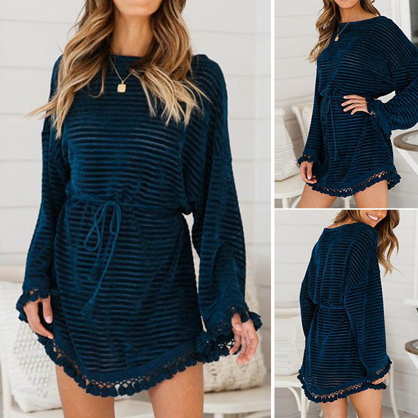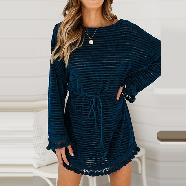 warm and soft fabric, feature a relaxed silhouette, round neckline, long sleeve, tassel trim accent at