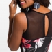 silhouette with an allover floral print, a sheer mesh spliced design, a round neckline, a sleeveless cut,