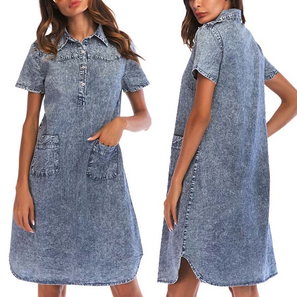 denim dress. It is finished with short sleeve and POLO collar design,the front-pockets design will lend you