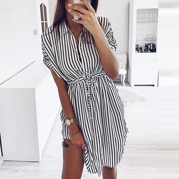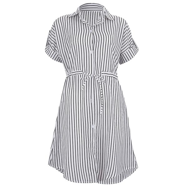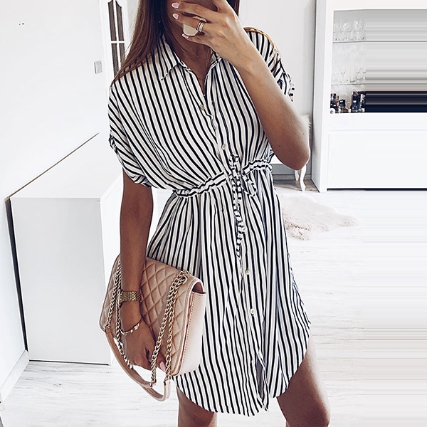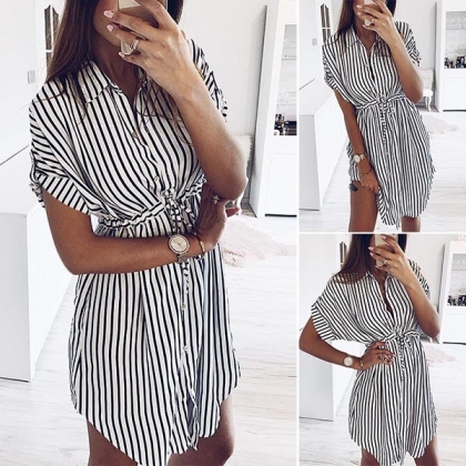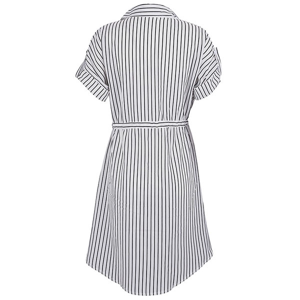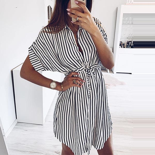 Fashion Short Sleeve POLO Collar Striped Shirt Dress