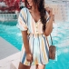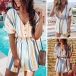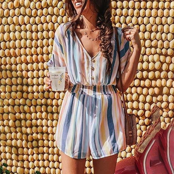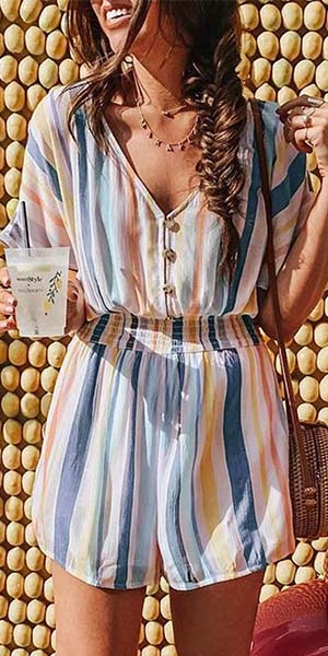 Looking for a dreamy, relaxed piece perfect for beach days, tropical getaways,or weekend out? This romper is the perfect choice. Striped style,finished with short sleeve,v-neck and high waist design,this piece not only can keep you cozy,but also can maintain your style. Let it accompany your summer days.