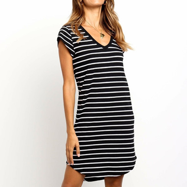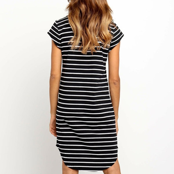 easy-to-wear dress. Striped element design makes it look stylish and popular. Outfitted with short sleeve