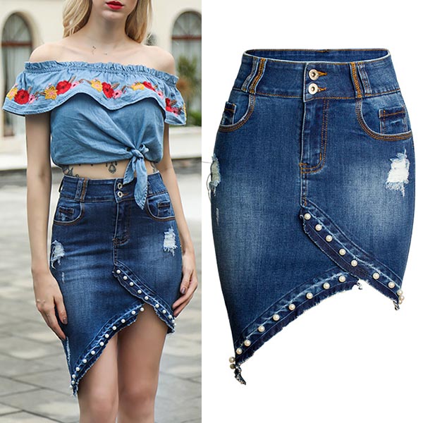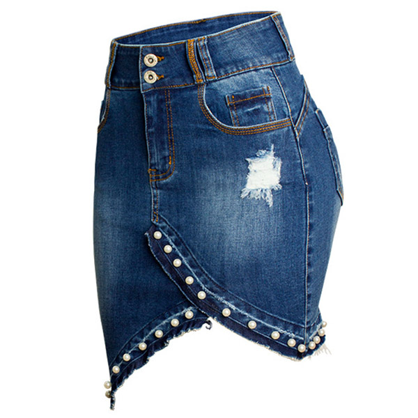with multi pockets,oblique hemline and many irregular pearls on the hemline.One concealed zipper fly