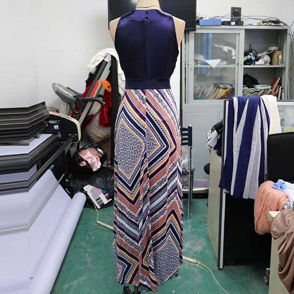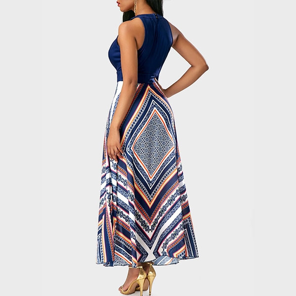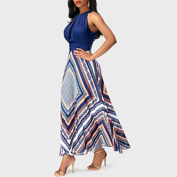 printed spliced hem design. It is finished with sleeveless,round neck and high waist design,this dress
