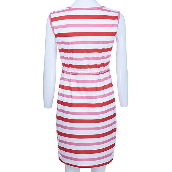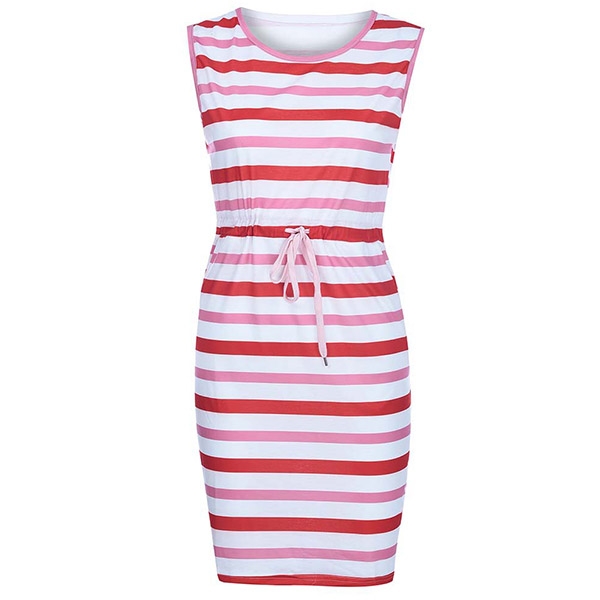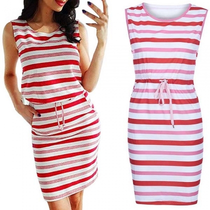 Striped style,finished with sleeveless,round neck,drawstring waist and a fit silhouette,this dress