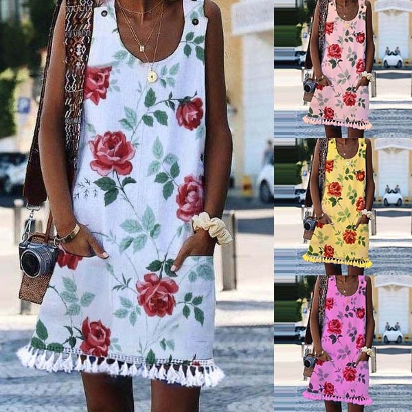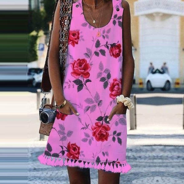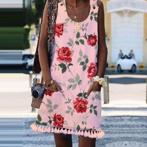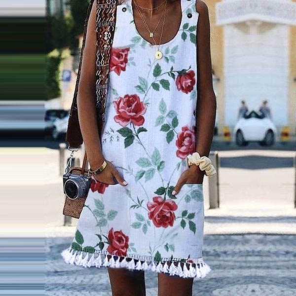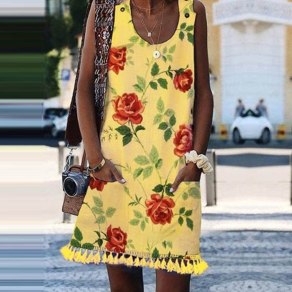 eye-catching printed details,with sleeveless,round neck and tassel hem design,this dress knows