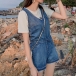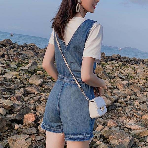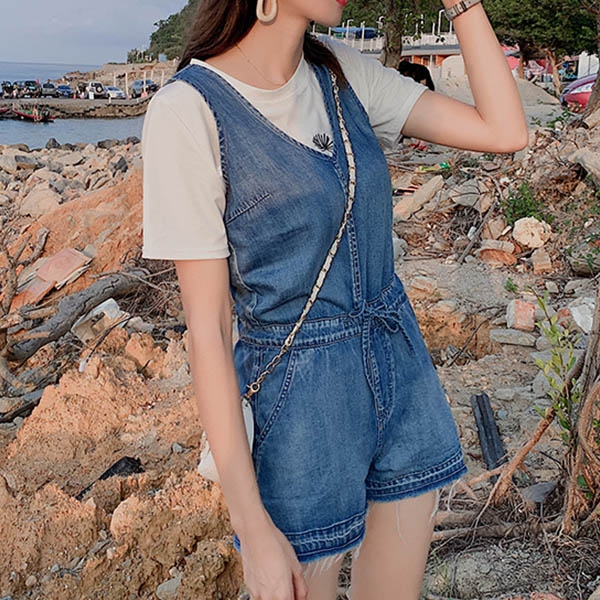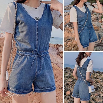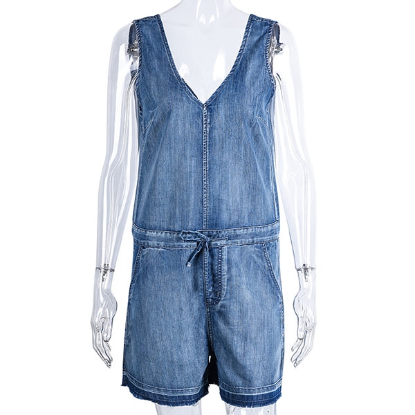 Enrich your wardrobe with this denim romper. It is finished with sleeveless,v-neck and drawstring