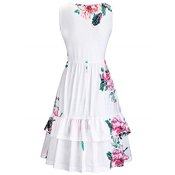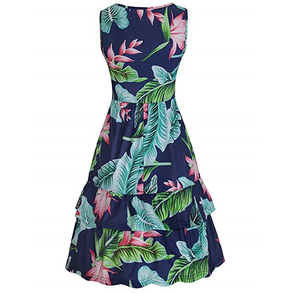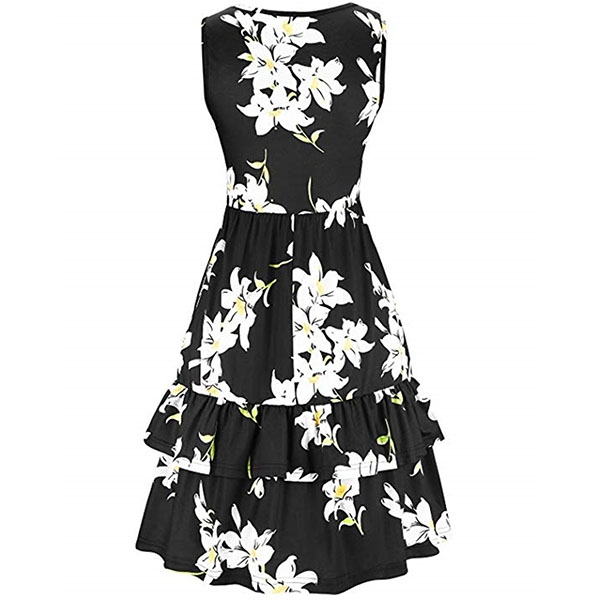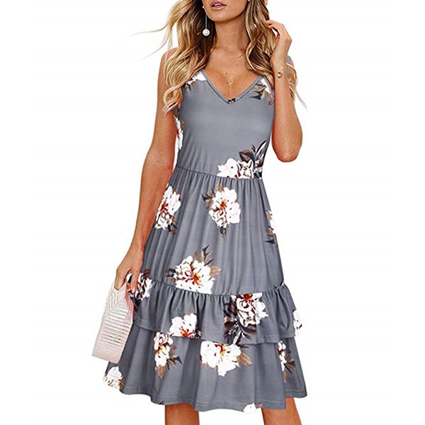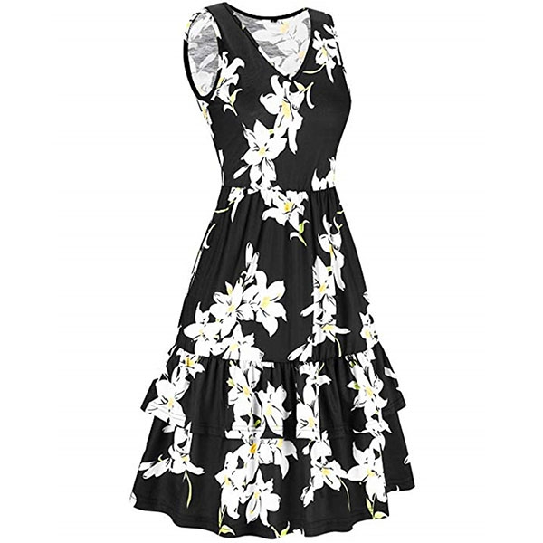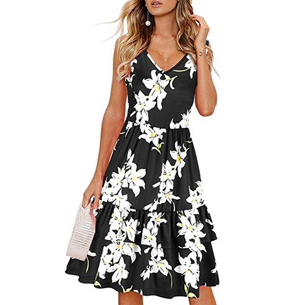 with vibrant floral print details,with sleeveless,v-neck and ruffle hem design,this dress